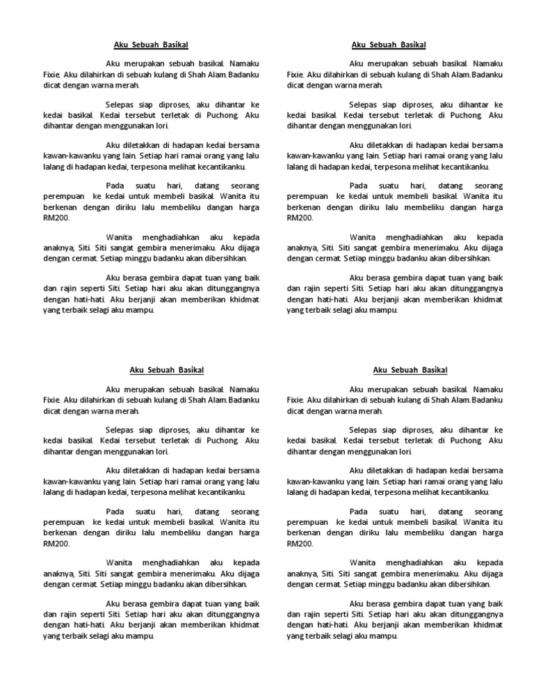 Di sini, aku dipamerkan kepada orang ramai. Tuliskan sebuah karangan yang bertajuk ’aku sebuah basikal“ “ibu bawa pulang basikal, ” kata budak lelaki itu.